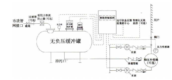 無(wú)負(fù)壓供水系統(tǒng)主要是接入自來(lái)水管網(wǎng),對(duì)需要增加水壓的時(shí)候進(jìn)行的一個(gè)工序。無(wú)負(fù)壓供水系統(tǒng)可以直接接入自來(lái)水管網(wǎng),水進(jìn)入產(chǎn)品的穩(wěn)流罐,罐內(nèi)空氣從真空消除器排出,待水充滿后,真空消除器自動(dòng)關(guān)閉。當(dāng)自來(lái)水管網(wǎng)壓力能夠滿足用水要求時(shí),系統(tǒng)由止回閥向用水管網(wǎng)直接供水。當(dāng)自來(lái)水管網(wǎng)壓力不能滿足用水要求時(shí),系統(tǒng)壓力信號(hào)由遠(yuǎn)傳壓力表反饋給變頻控制器,水泵運(yùn)行,并根據(jù)用水量的大小自動(dòng)調(diào)節(jié)轉(zhuǎn)速恒壓供水,若運(yùn)轉(zhuǎn)水泵達(dá)到工頻轉(zhuǎn)速時(shí),則啟動(dòng)另一臺(tái)水泵變頻運(yùn)轉(zhuǎn)。水泵供水時(shí),若自來(lái)水管網(wǎng)的水量大于水泵流量,系統(tǒng)保持正常供水。這就是無(wú)負(fù)壓供水系統(tǒng)原理,下面是無(wú)負(fù)壓供水系統(tǒng)原理示意圖