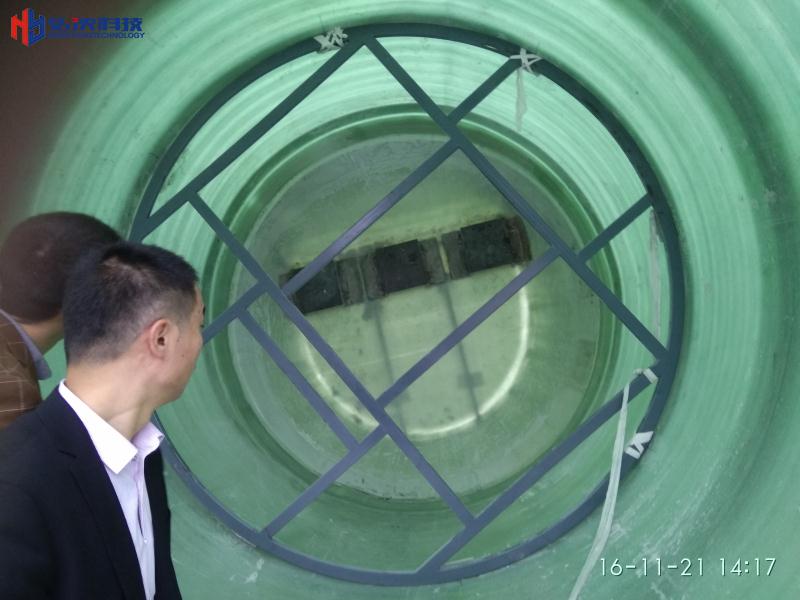 一體化污水提升泵站本體是采用玻璃鋼纖維機(jī)械纏繞工藝,外形為圓筒形,,針對(duì)項(xiàng)目需要處理的污水量制定筒體的直徑和高度。在筒體上分別留有進(jìn)水口和出水口,分別和管網(wǎng)連接,污水或雨水通過(guò)市政管路自流入泵站玻璃鋼筒體,筒體內(nèi)設(shè)有壓力傳感器或者液位傳感器系統(tǒng),當(dāng)液位達(dá)到一定高度的時(shí)候傳感器將信號(hào)傳送到控制系統(tǒng),控制系統(tǒng)控制潛污泵啟動(dòng)。潛污泵啟動(dòng)后將污水通過(guò)不銹鋼壓力管道提升到泵站筒體的出水口,泵站出水口和市政管網(wǎng)連接,污水進(jìn)入管網(wǎng)后排放到污水處理站。當(dāng)筒體內(nèi)水位下降到一定液位后控制系統(tǒng)發(fā)出停泵信號(hào),水泵停止。如此周而復(fù)始,為一體化污水提升泵站的整個(gè)運(yùn)行流程。