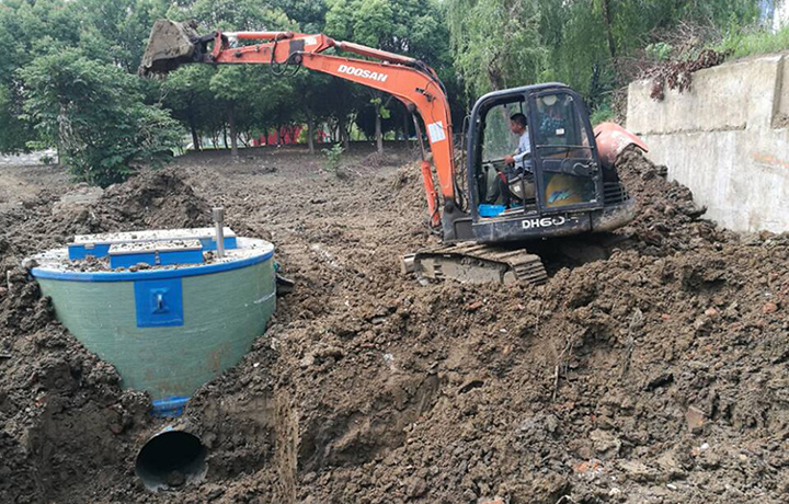 弘泱一體化雨水泵站工作流程:管網(wǎng)里的水通過泵站進(jìn)水口自流到筒體內(nèi)部,當(dāng)水位高度達(dá)到啟泵水位后液位傳感器向控制柜發(fā)送啟泵指令,這時(shí)候控制柜開始啟泵,潛污泵把水通過壓力管道抽送到泵站出水口,出水口與管網(wǎng)連接,壓力管道上面裝有閘閥和止回閥,防止排放出去的水回流到筒體內(nèi)。
