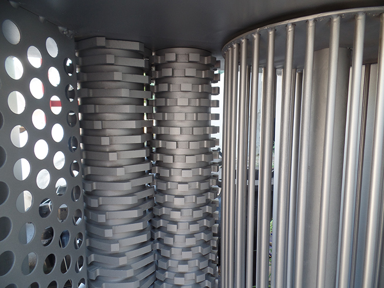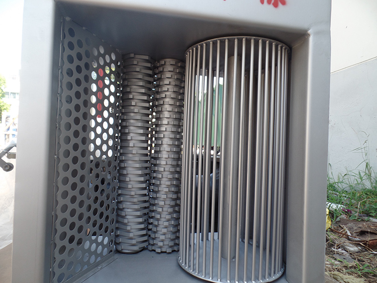 粉碎型格柵由干濕兩用防曝電機、齒輪箱、側(cè)板、傳動軸、刀軸、切割刀片、潛水電纜、電氣控制箱、立式轉(zhuǎn)鼓、密封件等組成。電機啟動后,刀片及立式轉(zhuǎn)鼓同時不等速轉(zhuǎn)動,污水中的固體漂浮物隨著污水進入轉(zhuǎn)鼓區(qū)后被旋轉(zhuǎn)的轉(zhuǎn)鼓截留并送到切割區(qū),兩組差速轉(zhuǎn)動的刀片迅速進行軸向和徑向切割,將其粉碎成6~10mm的小顆粒,其他大部分的污水和足夠小的顆粒直接通過轉(zhuǎn)鼓與粉碎后的小顆粒隨水泵抽水一起流走。